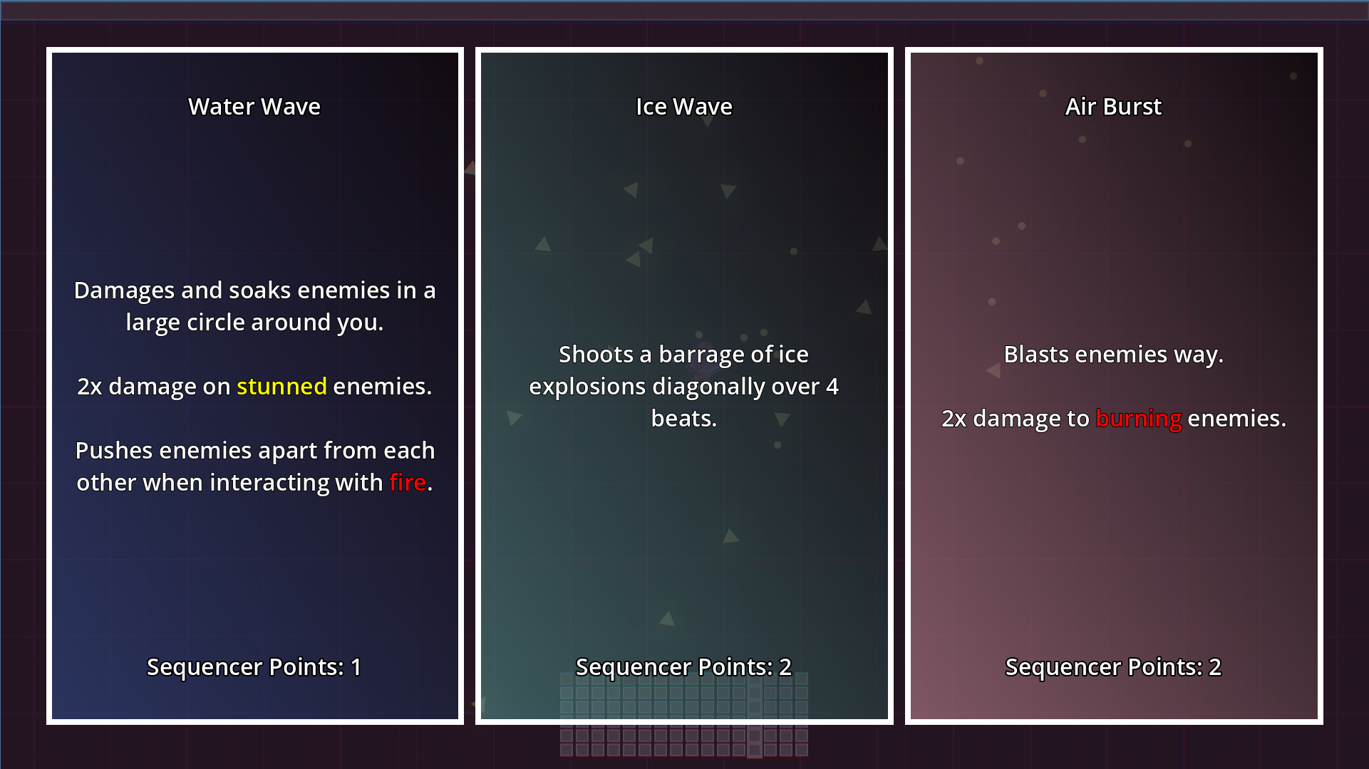 Pick your attacks and place them wisely. As the game progresses you will level up and get more attacks for your sequence. The goal is to live as long as possible and set a new high score.